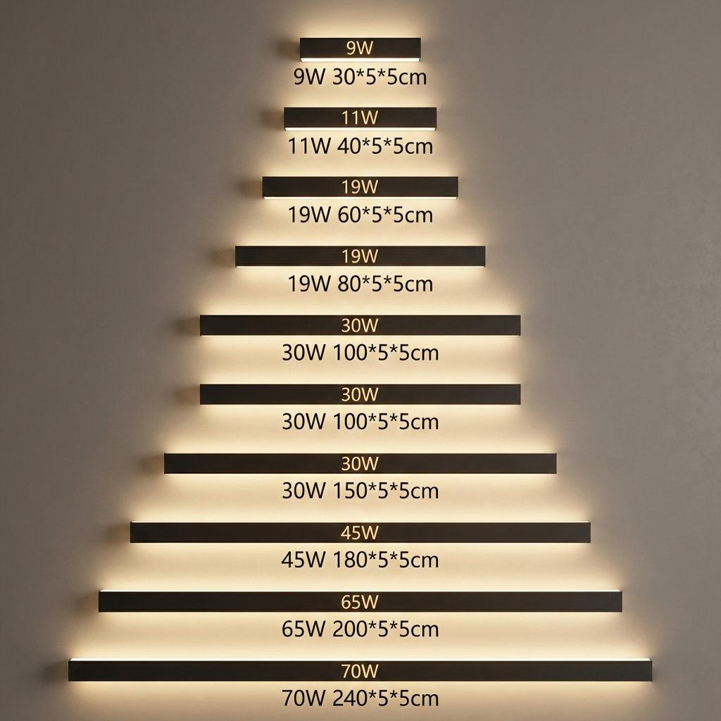 30 cm ~ 9W, 180Cm 55W, 60Cm 19W, 100Cm 30W, 120Cm 38W, 150Cm 45W, 200Cm 60W, 240Cm 90W, 170Cm 65W, 80Cm 24W, 30 cm 9W |